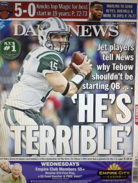En Nueva York ha pasado poco y nada con la «Tebowmania»: casi no juega y pese a la paupérrima campaña de los Jets esta temporada (tres victorias y seis derrotas), el coach Rex Ryan no ha dudado en ratificar al mediocre Mark Sánchez como el mariscal titular. ¿Por qué? Según la versión de sus propios compañeros que consigna el tabloide neoyorquino Daily News en su edición del 14 de noviembre, simplemente porque Tebow «es terrible».