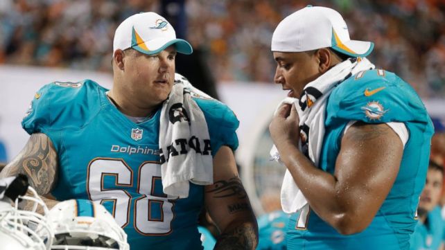 Los protagonistas –aunque una investigación de la NFL podría arrojar nuevos nombres- son los linieros ofensivos Richie Incognito y Jonathan Martin (en la foto, Incognito con el 68 y Martin con el 71).