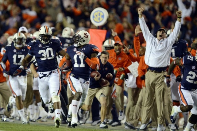 La patada de Griffith no fue mala, pero se quedó corta y cayó en las manos de Chris Davis, quien en vez de hincarse y enviar el partido a la prórroga…decidió correr el balón, cubriendo con 109 yardas el campo de juego de un lado a otro para darle la victoria a Auburn por 34-28 cuando el marcador ya había expirado, desatando la locura en el estadio, e inscribiendo su nombre en la historia del fútbol americano. PINCHE ACA PARA EL VIDEO DE LA JUGADA Y LAS REACCIONES DE HINCHAS Y PERIODISTAS.