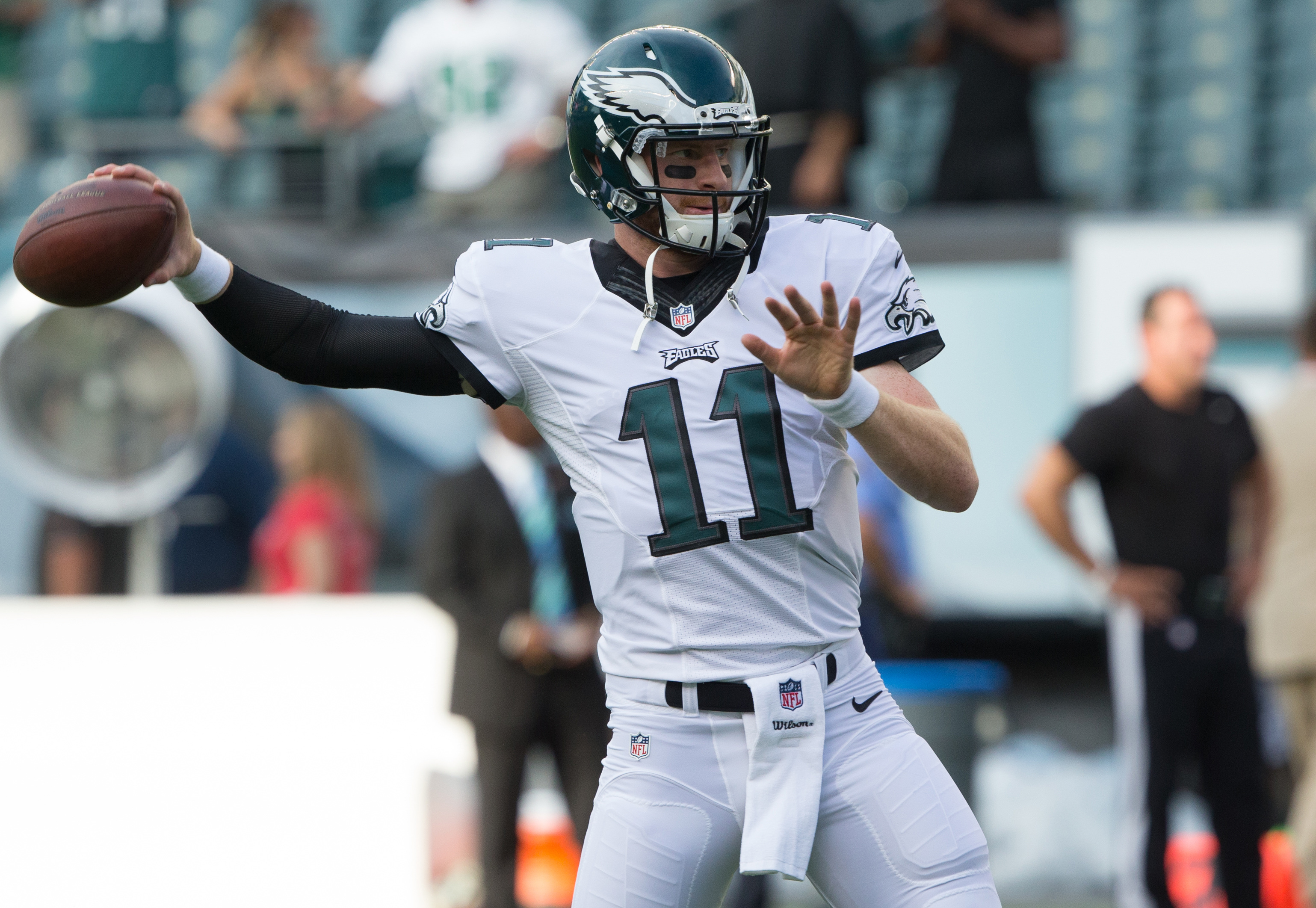 NFL: Preseason-Tampa Bay Buccaneers at Philadelphia Eagles Publicado el 7 septiembre, 2016 en 3077 × 2123 en Equipo por equipo: todos los quarterback titulares al comenzar la temporada Próxima imagen Aug 11, 2016; Philadelphia, PA, USA; Philadelphia Eagles quarterback Carson Wentz (11) warms up before action against the Tampa Bay Buccaneers at Lincoln Financial Field. Mandatory Credit: Bill Streicher-USA TODAY Sports