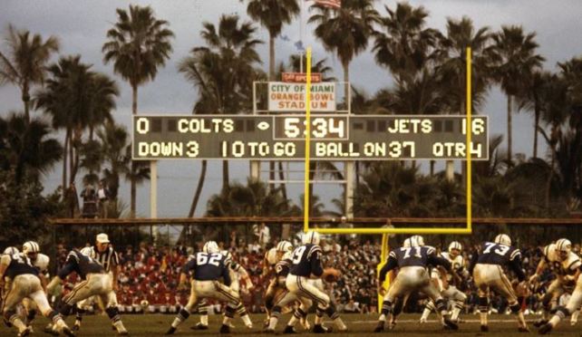 Una imagen del Orange Bowl, el estadio de los primeros cinco Super Bowls disputados en Miami. En la foto, Colts vs Jets en la final del 12 de enero de 1969, para el Super Bowl III que ganó el equipo de Nueva York.