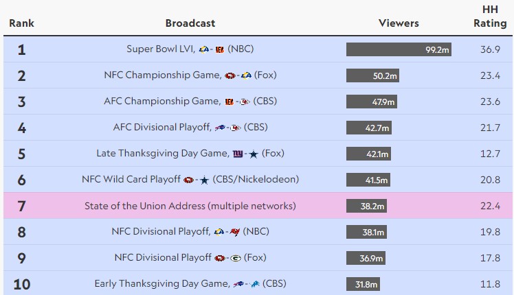 En el Top 20, 19 son partidos de la NFL, con la sola excepción del State of Union (se ubica 7°), el discurso anual del presidente de Estados Unidos, transmitido por cadena nacional y que más encima en 2022 estuvo marcado por la invasión de Rusia a Ucrania.
