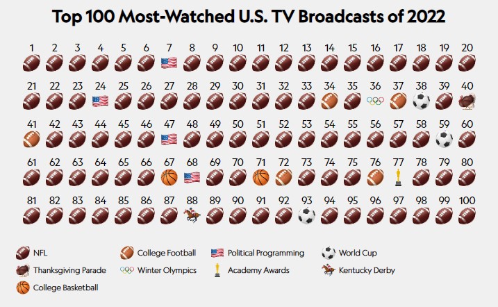 Entre los 18 eventos no de NFL que estuvieron entre los 100 programas más vistos en EEUU el 2022 destacan: la cobertura de las elecciones legislativas (24° – 25,4 millones); la final del fútbol americano universitario entre Georgia vs Alabama (34° – 22,6 millones) y, la final del Mundial de Fútbol entre Argentina y Francia (38° – 22,3 millones).